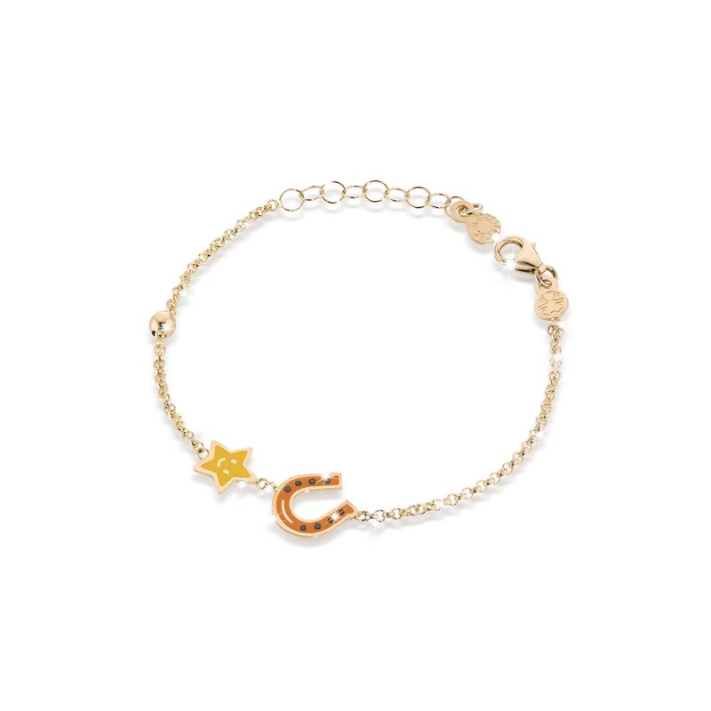 Bracciale Bambino Le Bebè collezione Prime Gioie modello Fortuna realizzato in Oro Giallo e impreziosito da un charm a forma di stellina e ferro di cavallo in smalto colorato Fortuna 12-14cm - PMG 037