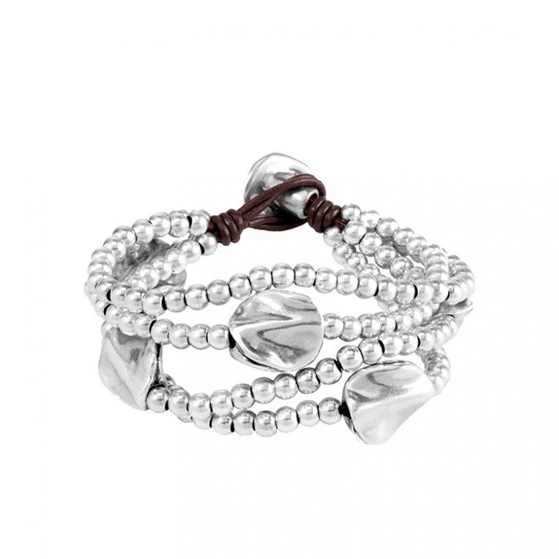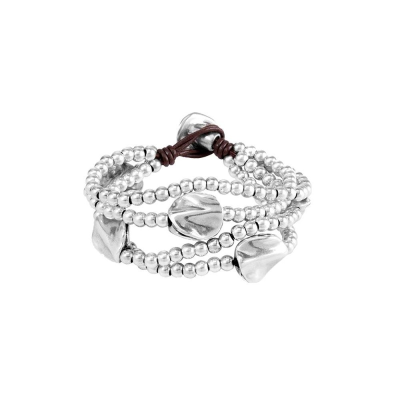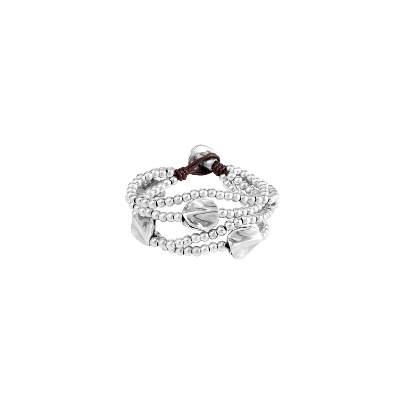 Bracciale da donna con più strisce di cuoio, con perle e chiusura bagnate in argento. Con il logotipo di UNOde50 inciso sulla chiusura.