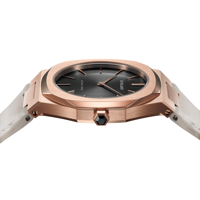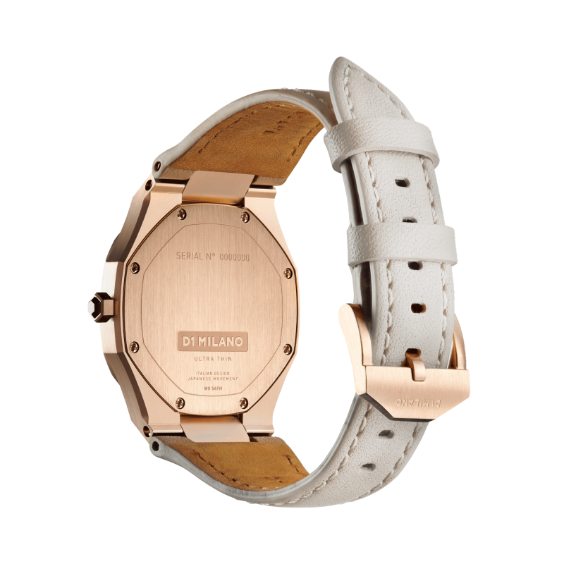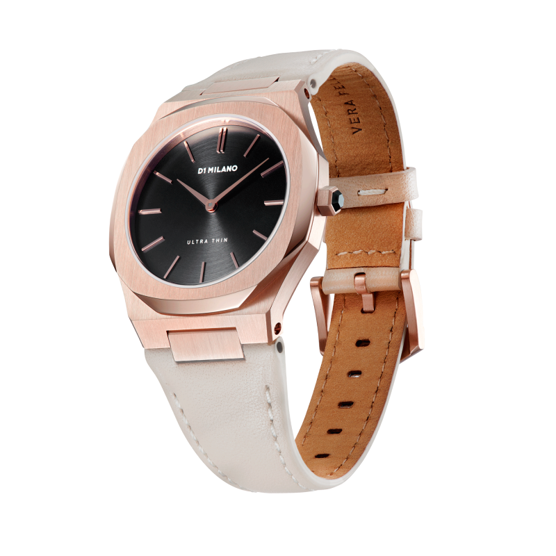 Orologio Donna D1 Milano modello Onix della collezione Ultra Thin Leather. Dotato di movimento Quarzo, cassa Oro rosa / Rose gold da 34mm con quadrante Nero e cinturino Tortora in Pelle naturale