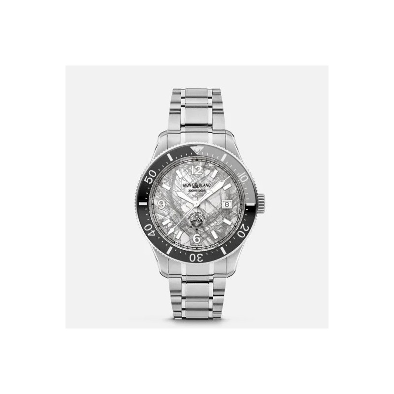 Il Montblanc Iced Sea Automatic Date con il suo quadrante grigio con motivo “ghiacciaio” dà l’impressione di guardare nelle profondità di un ghiacciaio ricco di minerali accumulatisi per millenni. Ispirata al Mer de Glace, questa texture glaciale è stata ottenuta utilizzando una tecnica ancestrale quasi dimenticata chiamata gratté-boisé. Il segnatempo da 41 mm è corredato di un bracciale in acciaio pregiato intercambiabile, che può essere sostituito in modo facile e veloce con un cinturino in caucciù nero con profilatura grigia senza bisogno di ritornare in boutique o utilizzare alcuno strumento. L’orologio è altresì regolabile al polso quando lo si indossa durante le immersioni subacquee. Il segnatempo è conforme alla normativa ISO 6425 per le immersioni subacquee, è impermeabile fino a 300 metri e presenta indicatori luminescenti che consentono la lettura anche in caso di scarsa illuminazione. Diametro della cassa 41 mm Spessore della cassa 12.9 mm Impermeabilità 30 bar (300 m) bar Tipo di ghiera Lunetta girevole unidirezionale Materiale della ghiera Stainless steel and ceramic Descrizione cristallo Vetro zaffiro bombato con trattamento antiriflesso doppio Corona A vite e scanalata in acciaio pregiato con emblema Montblanc in rilievo Quadrante Quadrante grigio con motivo “ghiacciaio” con numeri arabi e indici bianchi luminescenti finitura rodio Calibro A carica automatica Tipo movimento Movimento automatico Ore - Minuti - Secondi - Data Complicazioni Disco con data Numero di rubini 26 Jewels