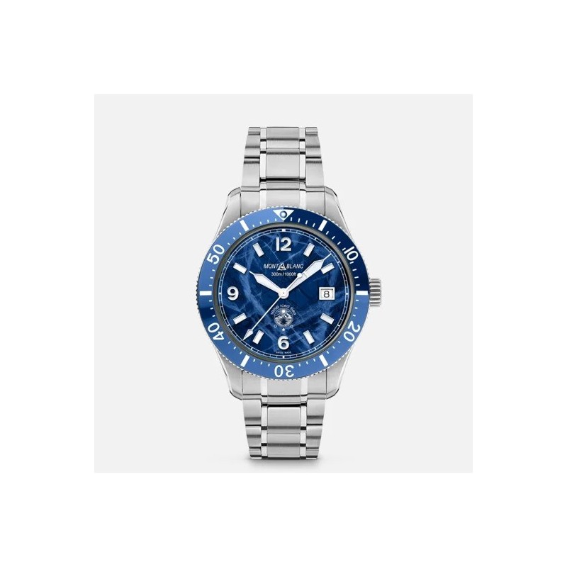 Il primo orologio da immersione sportivo di Montblanc, il Montblanc Iced Sea Automatic Date, presenta un quadrante con motivo “ghiacciaio” che dà l’impressione di guardare nelle profondità di un ghiacciaio. Questo quadrante blu con motivo “ghiacciaio” è ispirato al Mer de Glace (Mare di Ghiaccio), il ghiacciaio principale del Massiccio del Monte Bianco. La sua texture è stata ottenuta utilizzando una tecnica ancestrale quasi dimenticata chiamata gratté-boisé. Il segnatempo presenta inoltre una lunetta unidirezionale in ceramica bicolore, un fondello inciso e un bracciale conico in acciaio pregiato intercambiabile con regolazioni raffinate, per una vestibilità perfetta. Il segnatempo è conforme alla normativa ISO 6425 per gli orologi da immersione ed è impermeabile fino a 300 metri. Calibro A carica automatica Tipo movimento Movimento automatico Ore - Minuti - Secondi - Data Complicazioni Disco con data Frequenza (VPH) 4 /h 26 Jewels Diametro della cassa 41 mm Spessore della cassa 12.9 mm Impermeabilità 30 bar (300 m) bar Tipo di ghiera Lunetta girevole unidirezionale Materiale della ghiera Acciaio - Ceramica Descrizione cristallo Vetro zaffiro bombato con trattamento antiriflesso Corona A vite e scanalata in acciaio pregiato con emblema Montblanc in rilievo Quadrante Quadrante blu con motivo “ghiacciaio” con numeri arabi luminescenti finitura rodio