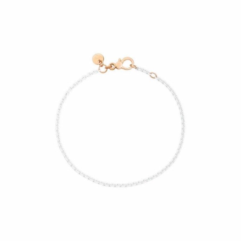 Bracciale in argento laccato bianco con chiusura e placchetta in oro rosa 9kt. Il bracciale 17 cm è regolabile anche per un polso di misura 16 cm. Il bracciale 19 cm è regolabile anche per un polso di misura 18 cm.