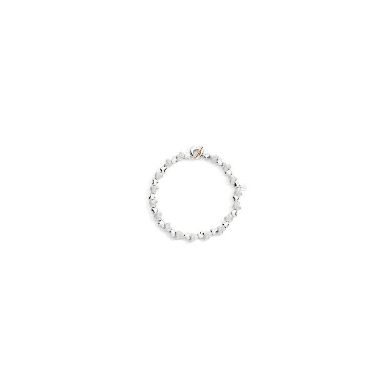 Evoluzione del bracciale Cuore 2025, arricchito dall’introduzione della finitura diamond-cut. I cuori in argento, alternati tra superfici lisce e diamantate, creano movimento grazie alle diverse dimensioni, in armonia con il cuore in oro rosa 9 kt. Completano il design catena e dettagli in argento 925 e acciaio, con t-bar in oro rosa 9 kt.