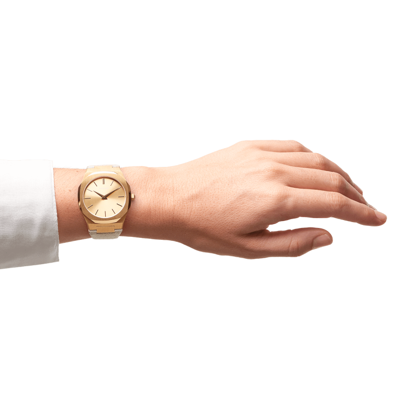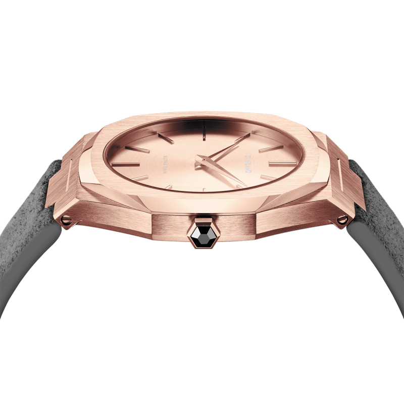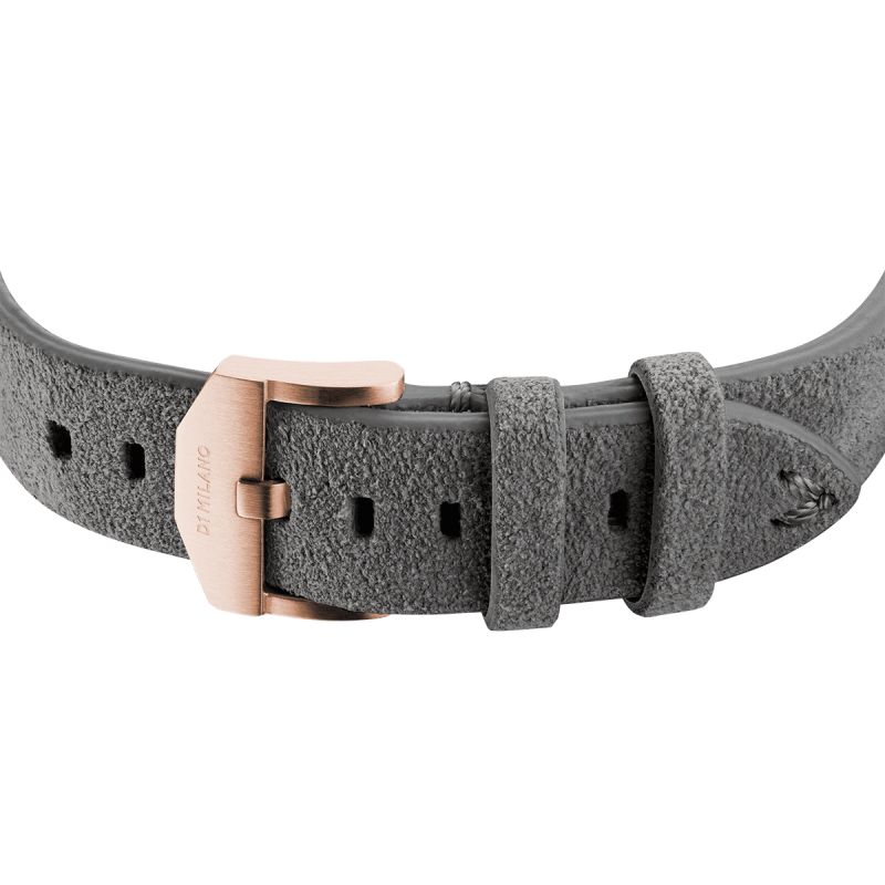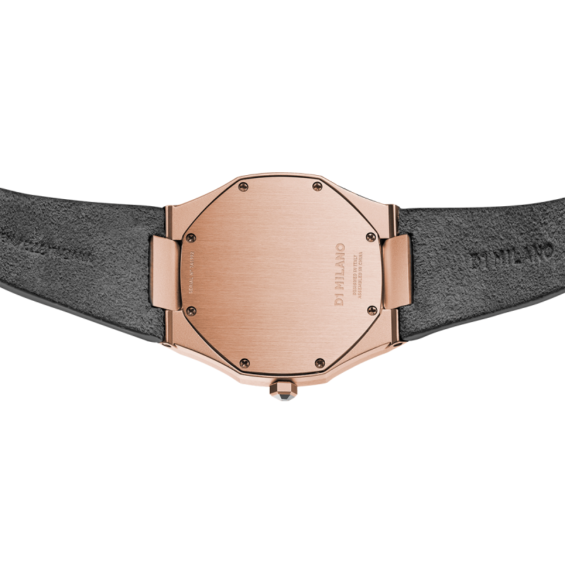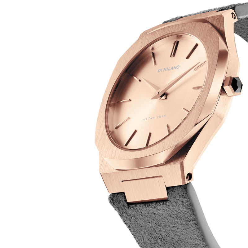 Orologio Donna D1 Milano modello Italian Gold della collezione Ultra Thin. Dotato di movimento Al Quarzo, cassa Oro Rosa da 38mm con quadrante Oro Rosa e cinturino Grigio in Pelle Scamosciata Italiana