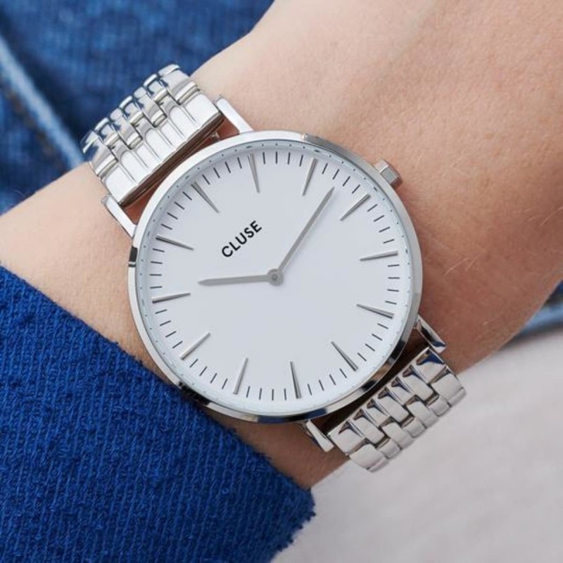 Stile minimal e raffinatezza. Eleganza in chiave contemporanea. Orologio La Boheme color argento con classico quadrante bianco e cinturino lucido a maglie. Maestoso ma sempre elegante, anche sui polsi piu' delicati. Come per tutti gli orologi La Boheme anche il cinturino di questo orologio e' intercambiabile con qualunque cinturino CLUSE da 18 mm.