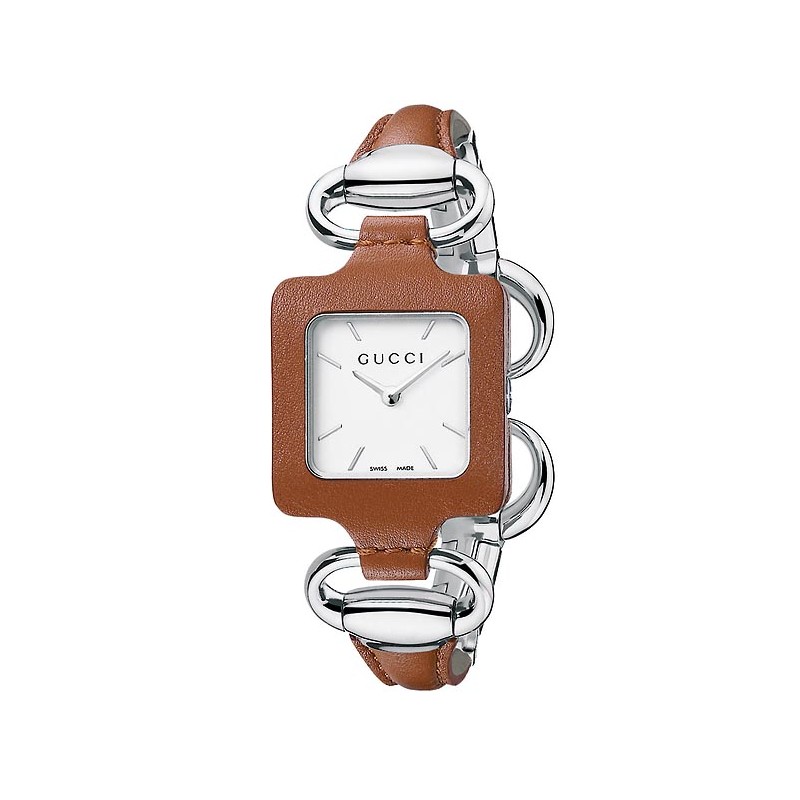 Collezione dedicata al 90esimo anniversario della Casa. Orologio con cassa quadrata in acciaio di 25×25 millimetri stile anni Venti, rivestita di pelle di vitello color cammello. Corona personalizzata con il logo della Casa, fondello con firma Guccio Gucci. Quadrante con superficie lucida marrone, indici a barretta e lancette di ore e minuti cromati, nome della Casa sotto il 12. Bracciale in acciaio e pelle e chiusura ispirati al classico motivo del morsetto Gucci. Movimento al quarzo, impermeabilità 3 atmosfere. Disponibile anche con cassa rivestita in pelle bianca, marrone scura, nera e quadrante abbinato